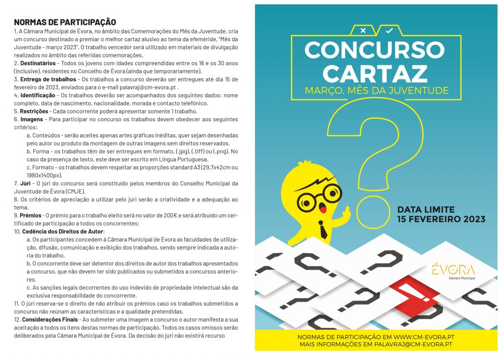A Câmara Municipal de Évora, no âmbito das Comemorações do Mês da Juventude, criou um concurso destinado a premiar o melhor cartaz alusivo ao tema da efeméride, “Mês da Juventude – Março 2023”. Os interessados/as poderão ver o seu trabalho, caso seja vencedor, utilizado na divulgação das atividades no âmbito das comemorações.