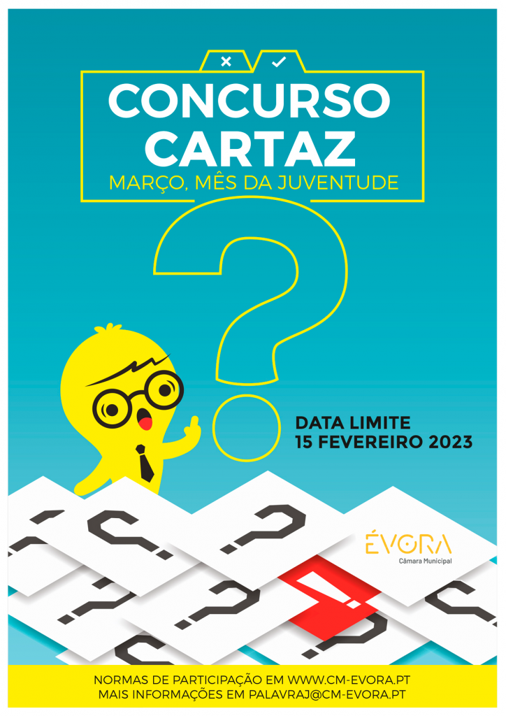 A Câmara Municipal de Évora, no âmbito das Comemorações do Mês da Juventude, criou um concurso destinado a premiar o melhor cartaz alusivo ao tema da efeméride, “Mês da Juventude – Março 2023”. Os interessados/as poderão ver o seu trabalho, caso seja vencedor, utilizado na divulgação das atividades no âmbito das comemorações.